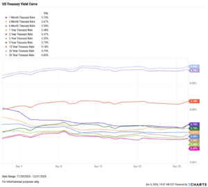 Treasury yields declined across the curve in November, with the 30-year yield serving as the lone outlier that remained unchanged. The largest decline occurred in the 2-year, which dropped 13 basis points to 3.47%, followed by the 5-year, which fell 12 basis points to 3.59%.