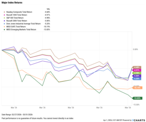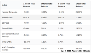 Markets fell hard in March, with Emerging Markets posting the worst month, down 13%. The S&P 500 and Nasdaq both dropped by nearly 5%, and all major indices were negative for the month.