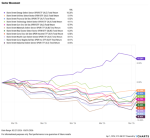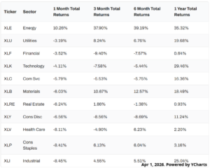 Sector performance followed a similar path, with all but one sector falling by more than 3% in March. The lone exception was Energy, which advanced 10.3% due to energy constraints resulting from the U.S. strikes on Iran in late February. This marks two consecutive months of near 10% gains in this sector.
