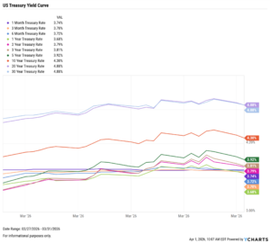 Treasury yields rose sharply in March, with the 1-month the lone exception, remaining unchanged at 3.74%. The 3-year saw the biggest advancement, up 42 bps to 3.81%. The 2-, 5-, 10-, and 20-year all ticked up by more than 30 bps.