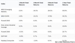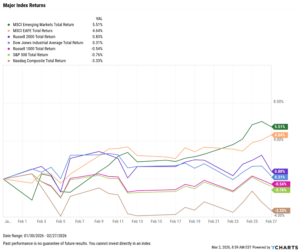 Markets posted a mixed February, as international equities finished in first once again. Emerging markets led the way, up 5.5% for the month, as the S&P 500 fell 0.8%. The Nasdaq posted the worst month of all indices for the second consecutive month, falling 3.3%.