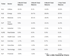 Sector performance diverged, with Utilities soaring 10.4% and Energy advancing 9.5%. Four sectors finished negative, with Financials lagging hardest for the second straight month, down 3.8%.