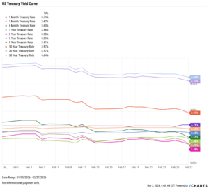Treasury yields fell sharply in February, with the 1-month the only one to increase, up just 2 basis points to 3.74%. The 10-year saw the sharpest decline, down 29 bps to 3.97%, while the 3-, 5-, 20-, and 30-year all dropped by more than 20 bps.