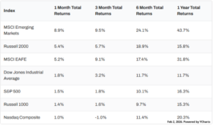 Markets pushed higher in January as internationals finished in first once again. Emerging markets led the way, up nearly 9% for the month, as the S&P 500 advanced 1.5%. The Nasdaq posted the worst month of all indices, though still growing 1%.