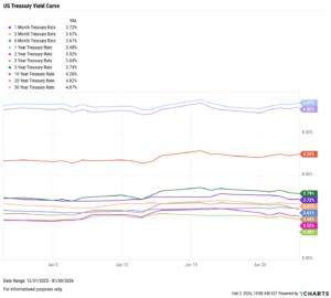 Treasury yield movements were small in January, though almost the entire curve ticked higher. The 1-month was the lone decliner, down just 2 basis points to 3.72%. The 3-month and 1-year rates went unchanged, while all others increased between 2 to 8 basis points.